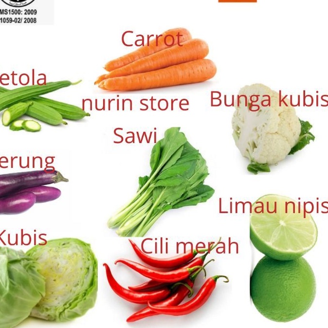 Biji kubis- potong biji bawang merah hiris nipis bawang putih hiris nipis st biji sawi st serbuk kunyit biji cili merah. 1 Labu 2 Cili 3 Kubis 4 Lobak Merah 5 Sawi 6 Brokoli 7 Bayam 8 Timun 9 Tauge 10 Saderi.